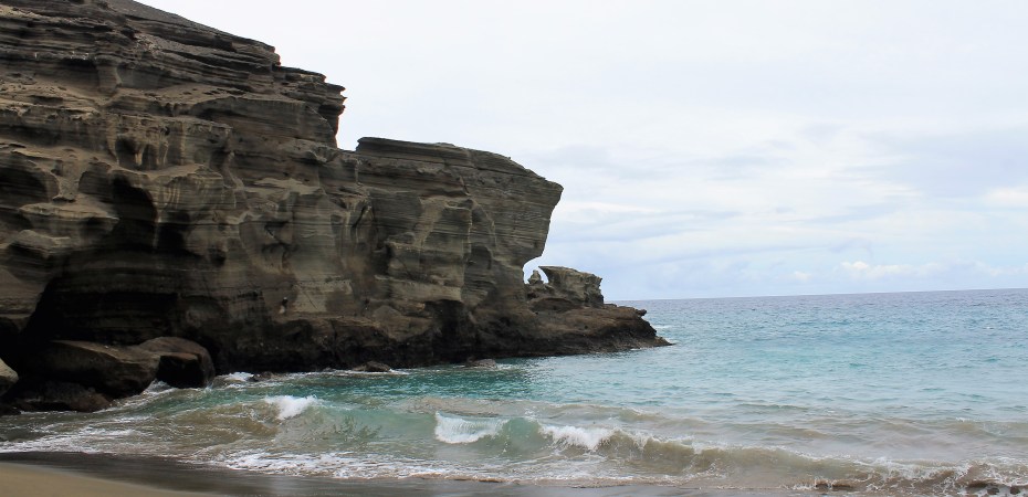 To be honest, we never would have made it. It took us at least fifteen minutes to drive there, up hills and over countless overlapping dirt roads and trails. The ride in the back was a blast and we got to the beach happy and healthy. The driver said he’d be back in case we, and other people in the front seat, wanted a ride back. The climb down to the beach was steep and intense. Kai decided to hang out about halfway down, and I nannygoated my way to the bottom. The green sand comes from the gem peridot, which, when ground down to sand size, is known as olivine. So the sand really was green! I took lots of photos and then climbed back to Kai where we sat for a while before taking the steep ladder the rest of the way.