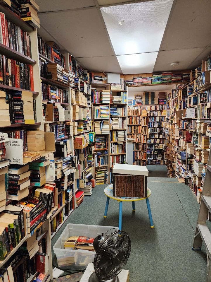 This bookstore is not the most labyrinthine I’ve been in, nor the least. It’s a lovely average used bookstore. Some assumptions can be made: the owner loves books and might have a hard time getting organized; passersby may not know it’s a bookstore because the windows are covered to protect the product and therefore foot traffic is more of a one-at-a-time pace; and careful placement has long since fallen by the wayside as stacks become towers and doorways narrow.