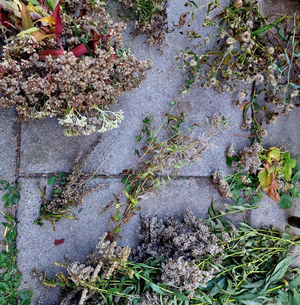 Fleabane (a favourite of native caterpillars and very happy to spread by seeds on the wind)